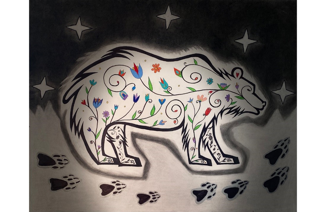 About the Submission: This piece is titled “Bear Medicine,” which is also my Apsaalooké name. I made this work personal to represent my dreams and manifestations for the future of my community. It is important to honor the traditions of the past to ensure a future of healing and resilience. The colorful floral bear represents a spirit helper that encourages healing through the dark times. The dark background and the 4-pointed stars show that our ancestors continue to guide us through darkness to a brighter future. The bear paw prints represent walking a good path for others to follow.