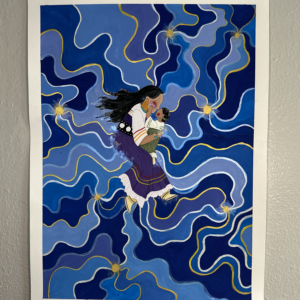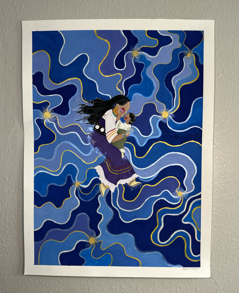 Where We Meet is inspired by what is sacred to me and that is quiet moments shared between my daughter and I. When I hold my daughter at night, speak softly or simply breathe beside her, everything else fades away. That feeling of safety, love and presence reflects what is important to me. Using acrylic, gouache and iridescent paint, I wanted to show the energy between us. The flowing lines and shimmer were influenced by Oscar Howe’s movement and color, capturing a bond that feels vibrant, spiritual and deeply rooted.