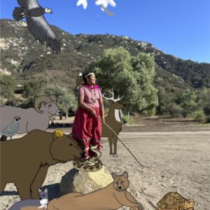 My art piece is about playing a game that I enjoy very much and have played my whole life. The game is called Shinny. I made it because I wanted to showcase how people play with friends and relatives. I wanted to show how I would have friends or relatives playing with me on a team. Since I believe that animal are our relatives, I drew my relatives as animals playing with me.