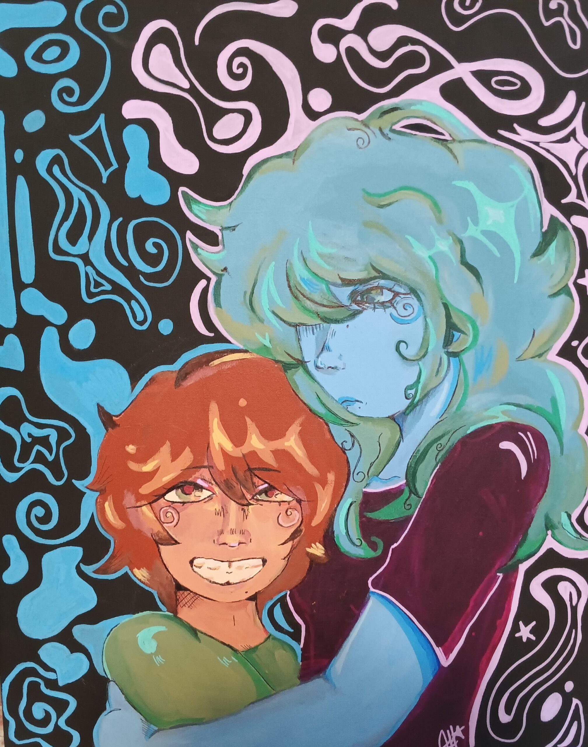 This is an acrylic painting made to show how sacred our youth and childhood is. You may brush off your younger self, but they are always with you. They are the ones that started our dreams, goals, accomplishments and who we are today. The painting represents the bond I still have with my younger self, holding on to them despite how much I’ve changed. Without the creativity I had as a kid I wouldn’t be a dreamer like I am today, and that is why I believe our childhood is so sacred.