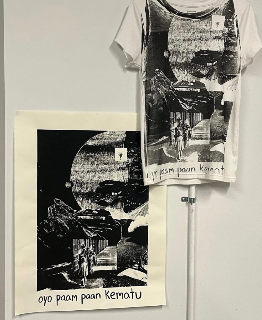 This collage centers an image taken from a LIFE Magazine giving primary source coverage of the Alcatraz occupation. In the photo a man in regalia opens the prison cell for a child. The collage also has a bristlecone pine, some of the oldest living beings on earth- that only grow in Nevada and Utah. I screen printed this collage with a phrase in shoshone from a prayer: oyo paam paan kematu, forever beside the water. My hope is that in the future, regardless of landscape, the shoshone language will persist beside the water.