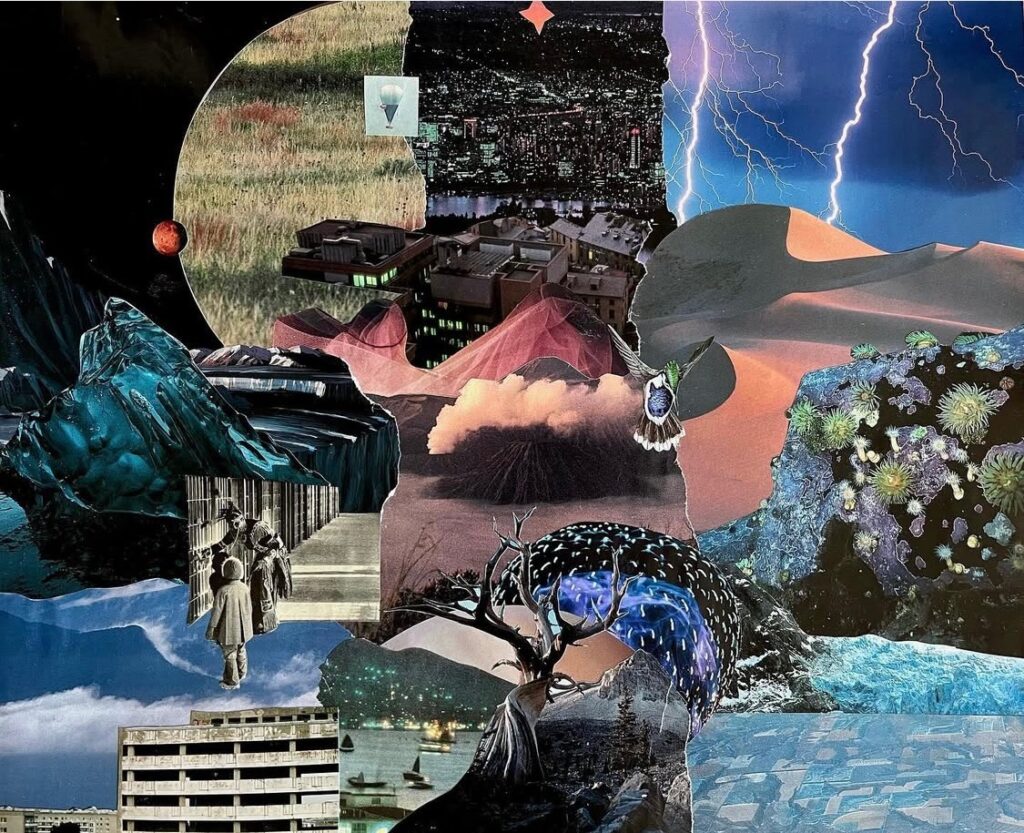 Eva Brander Blackhawk (Te-Moak Tribe of Western Shoshone) is a mixed-media artist engaging in collage, screenprinting and beyond. Primarily, she collages scraps and memories to create dreamscapes past, present, and future. She might reimagine LIFE Magazine pages of the Alcatraz occupation in the 1960s alongside reworked photographs from Edward Curtis, with her own screen printing and photography incorporated as well. In this way she creates otherworldly representations from her own perspective as a 21st century Native woman. You can find her on instagram @evascollectionofart.