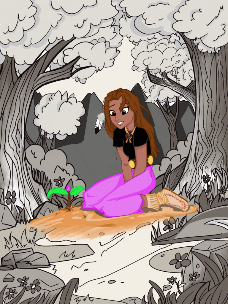 Life is sacred to me. The connections we make, the memories we share, even when we are young and born small, that’s when it all begins. I wanted to draw a piece of a young Native girl admiring a flower that is just starting to bloom. She admires the life it has, the beautiful flower it will grow to be. The black and white in the background symbolizes that the life around us, the world we live in, is beautiful. But as we take the time to be with loved ones, see them grow, nothing compares to that moment.