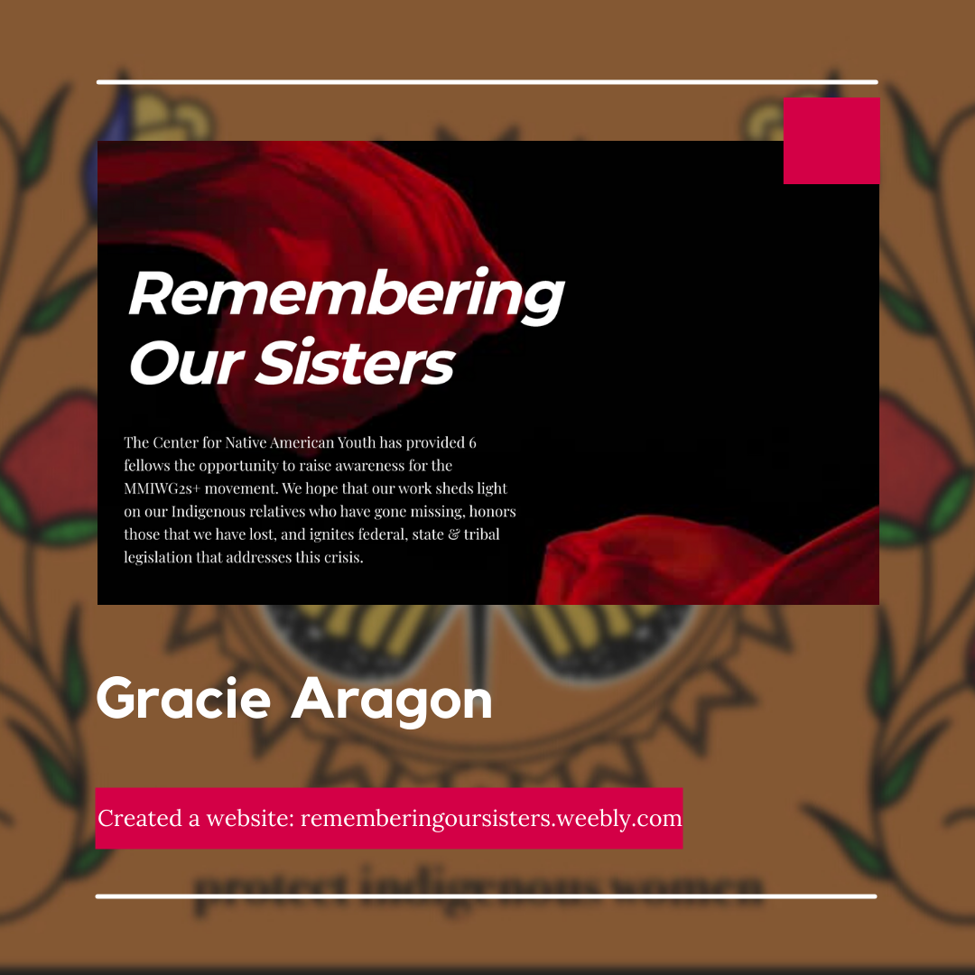Gracie is an advocate for returning to traditional lifeways, which she feels requires the deconstruction of tools of settler privileges, colonial ideologies and approaches. She is honored to serve as a 2022 Remembering Our Sisters Fellow and hopes to effectively address and raise awareness for the MMIWG2S Nationwide Crisis, honor the sisters we have lost to land + body violence, and advocate for effective, comprehensive policies that protect and ensure quality of life for Indigenous relatives.