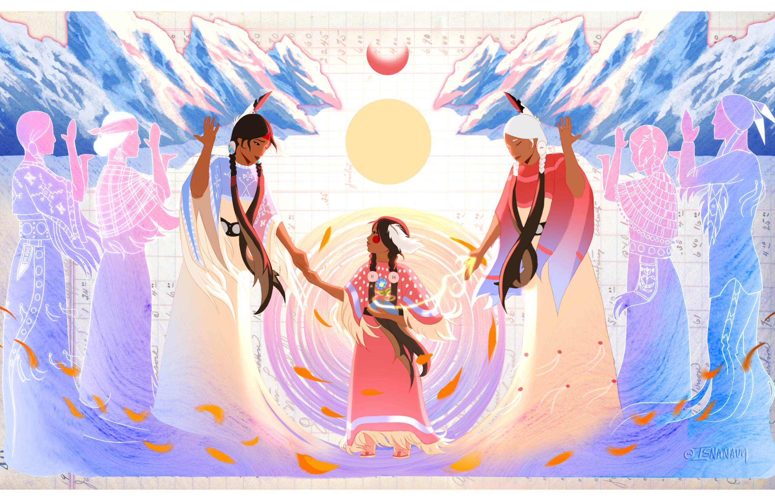 “The 7th generation prophecy, and the weight we carry on our shoulders for our youth to become Whirlwinds of Ancestral Knowledge.” The weight, traumas, and hardships the past and current 7 generations (as depicted) had to carry for this prophecy to finally show hope, change, renewal for our people. The courage it takes to break and heal from generational traumas despite how isolating and difficult it can be at times for the sake of the next generations wellbeing and Being conscious in the way we carry ourselves, treat, teach, guide our youth is what is most sacred to me.