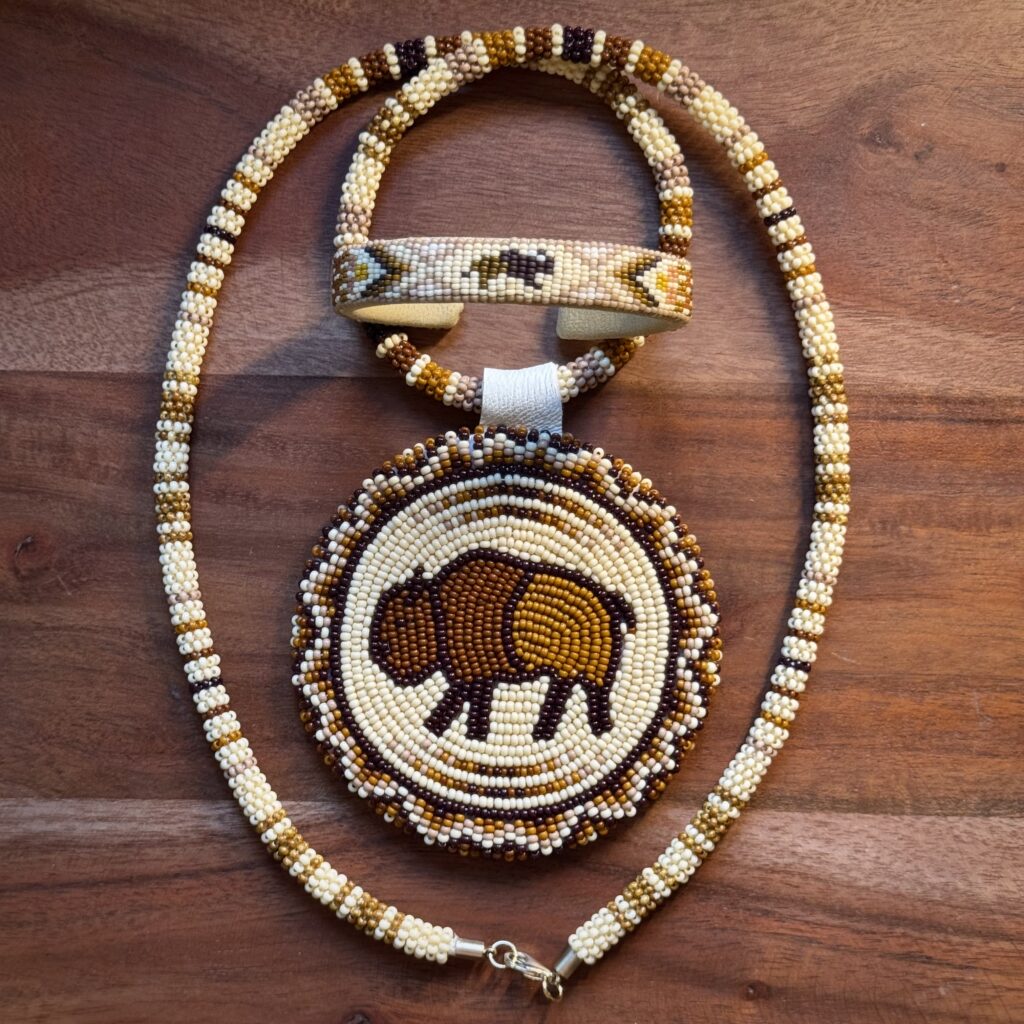 This piece is a matching beadwork set featuring the bodzen [bison]. Bison are sacred to many tribes, but they hold a special place for Newe [the Eastern Shoshone], who are stewarding bison herds in hopes of restoring their dominion over the Great Plains. Both a historical and modern day keystone species for our homelands, the bison are sacred creatures that appear frequently in my work. This piece is my personal ode to the bison who I will proudly represent when wearing this beadwork.