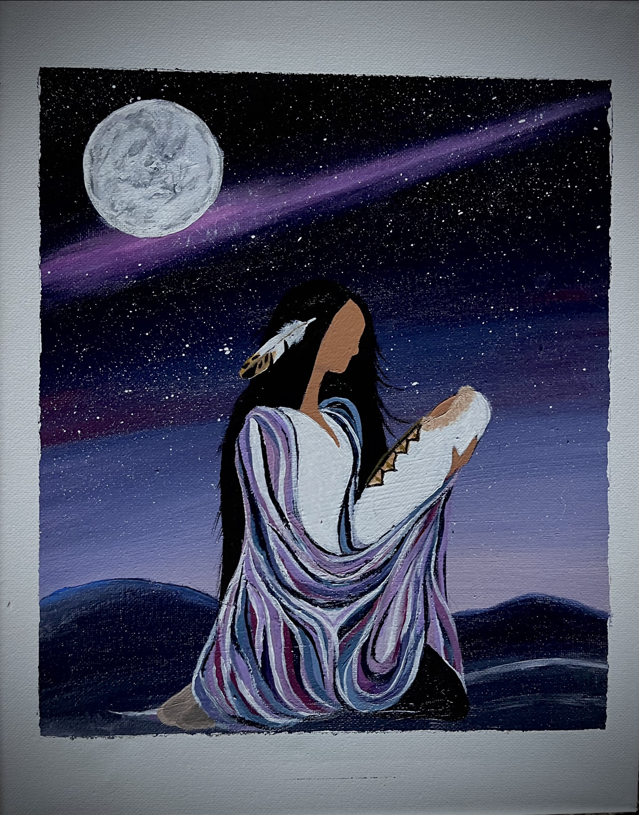 My art piece shows the bond between a mother and her newborn baby. While she is on her knees surrounded by hills, this shows the touching moments between her and her child. She wants her child to have a strong future. A hopeful future. A future filled with love and ebullience. The stars surrounding them brings peacefulness, while the moon has a bright glow of hope. Her shawl, feather, and baby’s papoose holds onto our culture. The future of the Native Americans on this reservation is a bright one. Our community helps each other out whenever we need it.