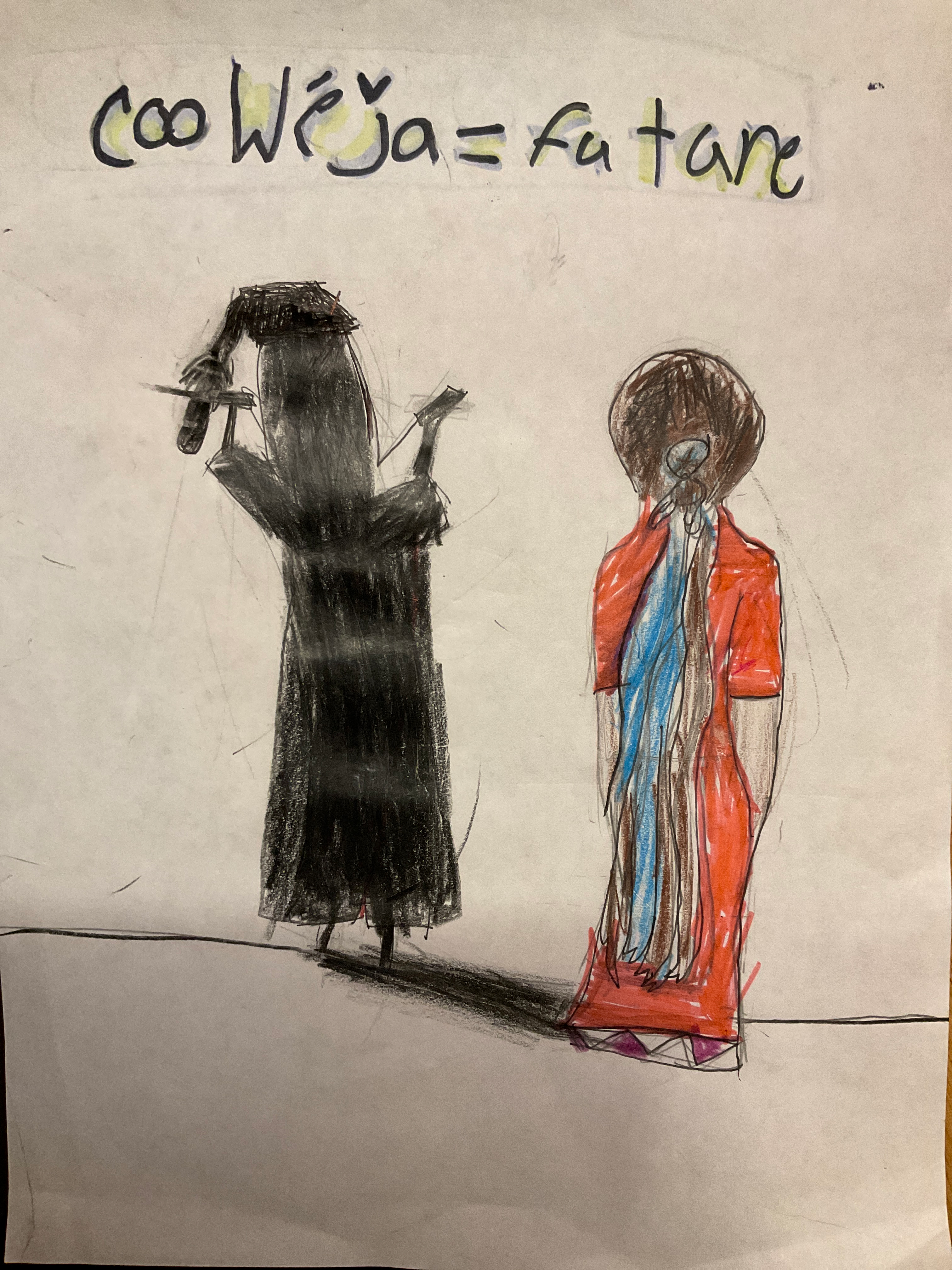 Coowéja(Cho-wayjah) is the Ho-Chunk word for future. The picture drawn is me now and the shadow is me in the future. In the left hand is a paint brush and on the right is a diploma.