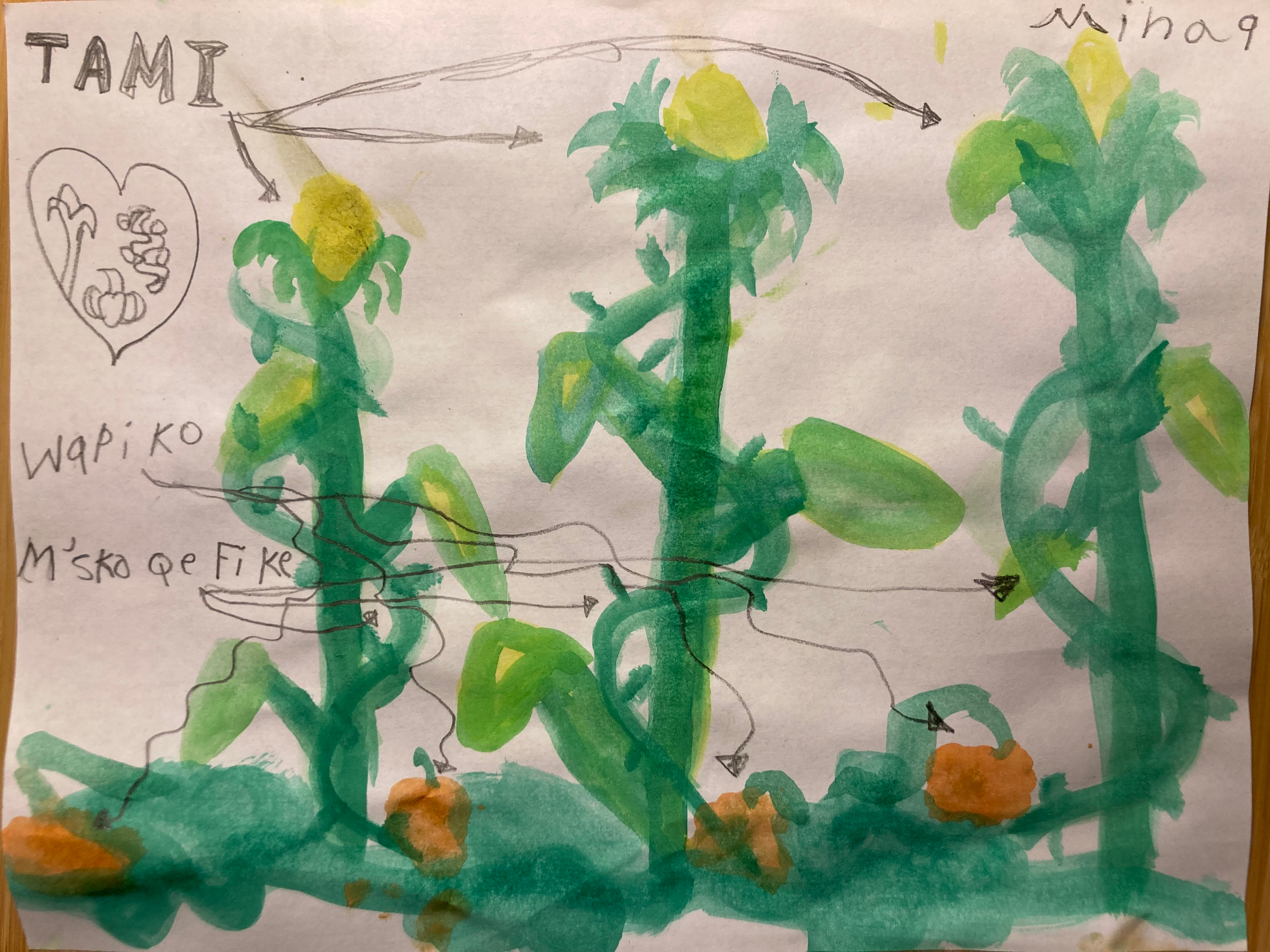 I painted this piece in watercolor. I did this because I really like gardening and sometimes when I’m gardening, I get to spend it with my mom and I really like talking to her about plants. And last year we grew popcorn! And we popped it and we have a secret recipe for popcorn so we sent it to family and friends so they can enjoy it too. And this year we are growing pumpkins. In Shawnee culture, these foods are important because they feed our people.