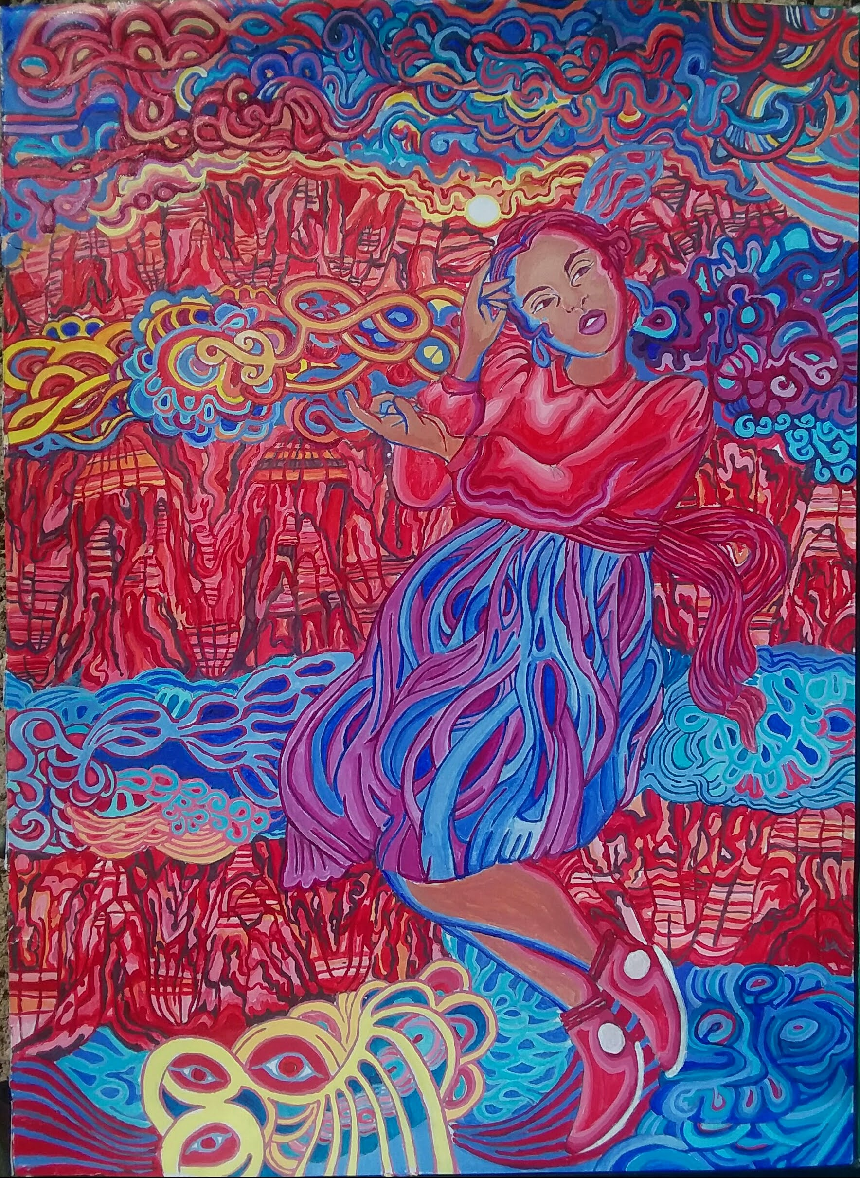 My painting features many designs that come together to make a full picture. The focal point is a Navajo girl. I wanted to represent the modern native girl, so I drew her in traditional attire but updated in bright colors and designs. I was also inspired by colors and designs in the sky and mesas, and I tried to revitalize their beauty and uniqueness using abstract patterns and designs full of color. This is what I hope to see for the future; our traditions and culture being revitalized in our modern times. Keeping our traditions alive but using new mediums.