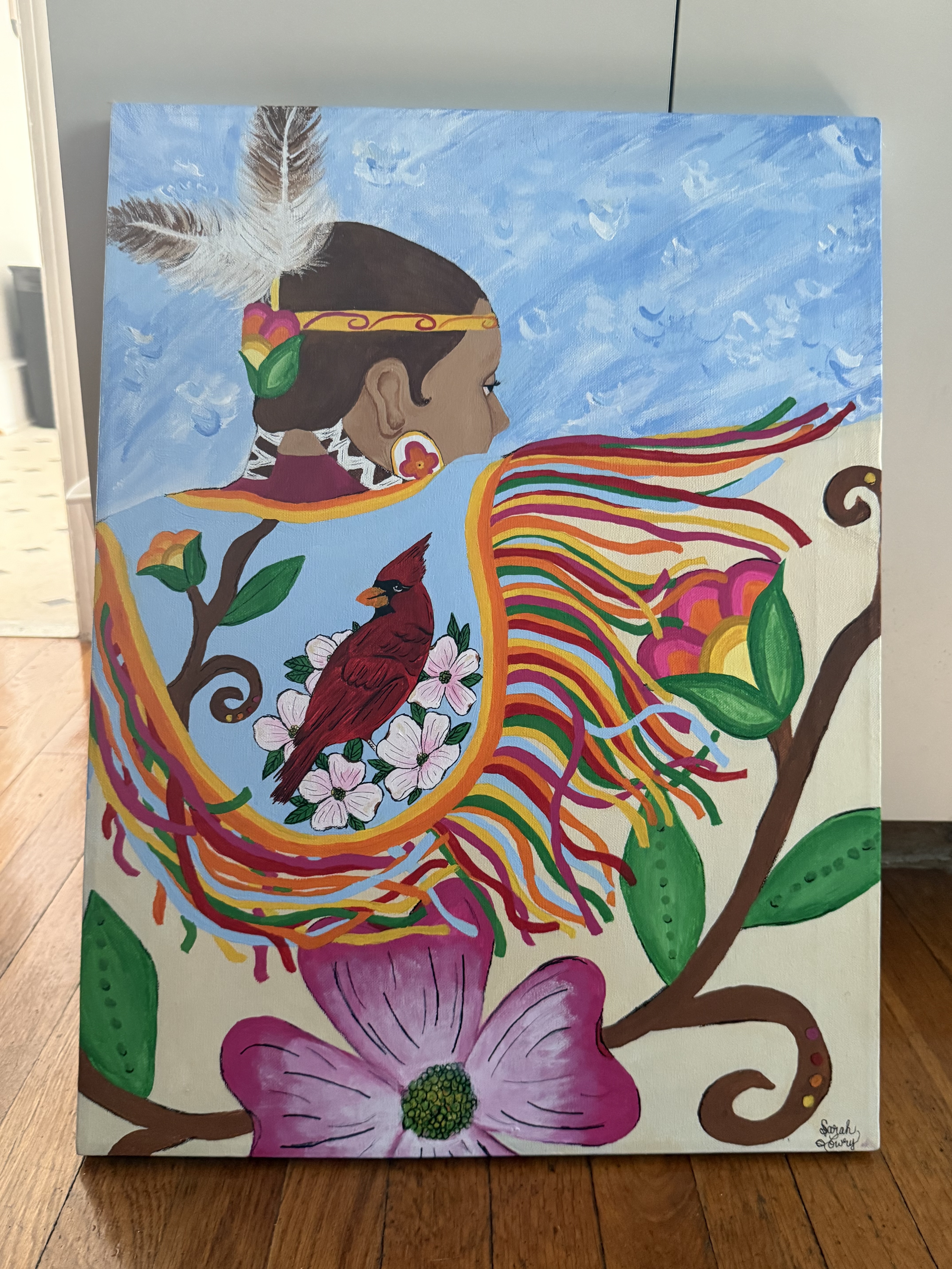 With this piece, I imagined the life I might have had as a fancy dancer, inspired by my late uncle Derek, who was deeply involved within our Native community. Cardinals hold sacred meaning and honor my late grandparents, whose love of art continues to guide and inspire me everyday. Each color holds personal meanings and are painted from the memories of my grandparents and my mother, serving as a tribute to their love and guidance. Through this piece, I celebrate my culture, honor my family, and share stories of the people that have shaped me into who I am today.