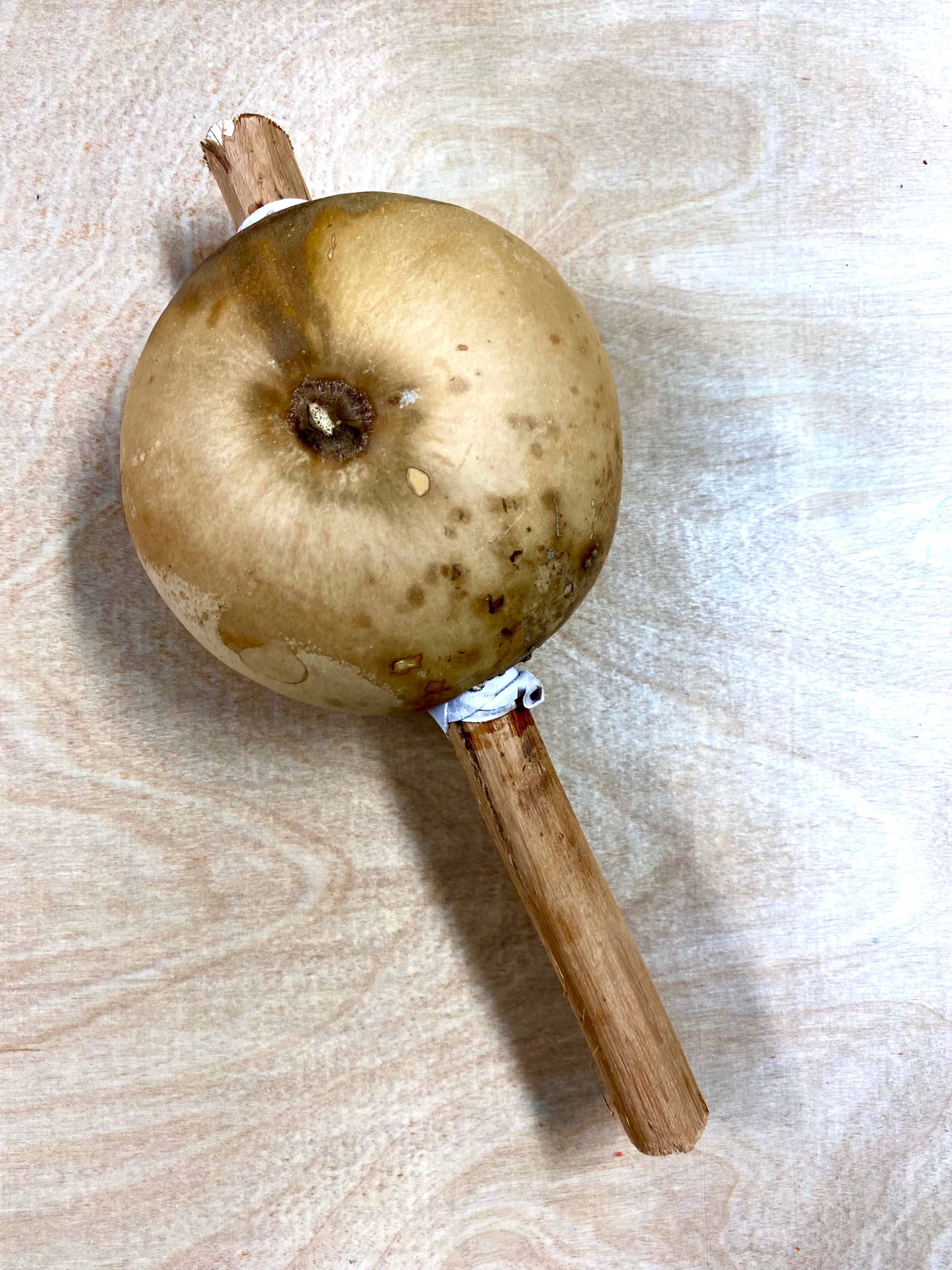 2021 Creative Native Artist 11, Mescalero Apache Tribe traditional rattle made from natural Tesuque Pueblo gourd. leather and pebbles from ant piles.