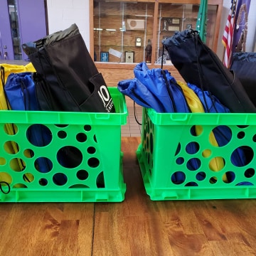 We circled around the classroom tables to package backpacks with schoolwork and supplies for our students. After, we separated them into piles based on where they live, we organized deliveries to go out on Tuesday.